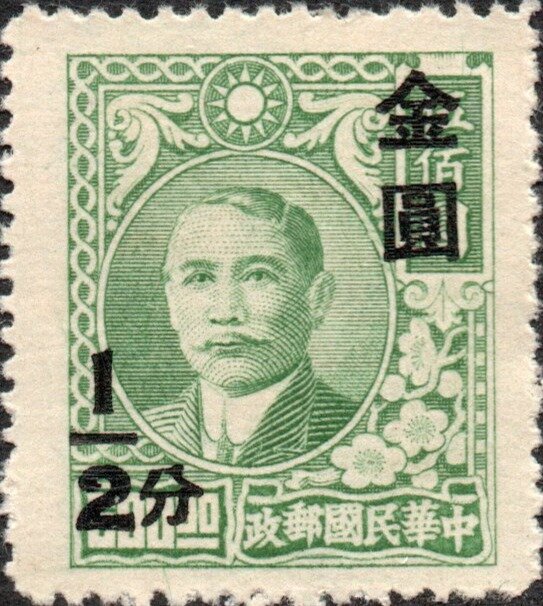Visibility: public Image owner: none China postage 1/2c blgrn issue=1948f d=Sun Yatsen (1946 a) oc=blk on=1947-$500-blgrn unwmk Crops No visible images cropped from this one. Measurements Resolution is unknown. Source Source name: Colnect File URL: http://i.colnect.net/b/6119/056/Dr-Sun-Yat-sen-and-Plum-Blossoms-Gold-Yuan-surcharge.jpg Uploaded November 15, 2019, 5:34 pm by Stan Shebs |