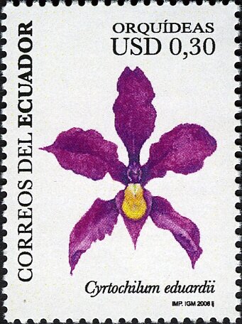 Visibility: public Image owner: none postage 9/29/2006 $0.30 multi issue=Ecuadorian Orchids 2006 dt=Ecuadorian Orchids (2006) d=Cyrtochilum eduardii unwmk Crops No visible images cropped from this one. Measurements Resolution is unknown. Source Source name: Colnect File URL: http://i.colnect.net/b/5837/333/Cyrtochilum-eduardii.jpg Uploaded November 22, 2019, 11:56 pm by Stan Shebs |