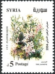 Visibility: public Image owner: none postage 6/15/2004 5lb multi issue=International Flower Show 2004 dt=flowers (2004 Syria) d=jasmine (2004) unwmk Crops No visible images cropped from this one. Measurements Resolution is unknown. Source Source name: Colnect File URL: http://i.colnect.net/b/1428/653/Jasmine.jpg Uploaded August 27, 2014, 1:55 pm by Stan Shebs |