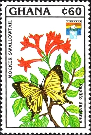 Visibility: public Image owner: none postage 5/25/1992 60c multi issue=Genova '92 dt=butterflies (1992 Ghana) d=Papilio dardanus (1992) unwmk perf=14.25 Crops No visible images cropped from this one. Measurements Resolution is unknown. Source Source name: Colnect File URL: http://i.colnect.net/b/5994/581/Mocker-Swallowtail-Papilio-dardanus.jpg Uploaded December 4, 2019, 7:04 pm by Stan Shebs |