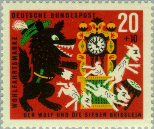 Visibility: public Image owner: none semipostal 9/23/1963 20+10(pf) multi issue=Charity 1963 dt=The Wolf and the Seven Kids wmk=DBP & rosettes Crops No visible images cropped from this one. Measurements Resolution is unknown. Source Source name: Colnect File URL: http://i.colnect.net/b/152/449/Fairy-tales-Grimm.jpg Uploaded August 27, 2014, 2:00 pm by Stan Shebs |