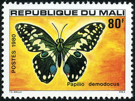 Visibility: public Image owner: none postage 10/6/1980 80fr multi dt=butterflies (1980 Mali) d=Papilio demodocus (1980) unwmk Crops No visible images cropped from this one. Measurements Resolution is unknown. Source Source name: Colnect File URL: http://i.colnect.net/b/5875/860/Citrus-Swallowtail-Papilio-demodocus.jpg Uploaded December 20, 2019, 6:53 pm by Stan Shebs |