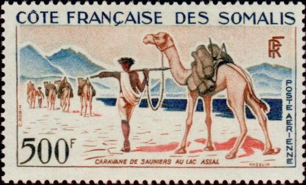 Visibility: public Image owner: none airmail 1/6/1962 500fr multi d=Caravan of salt workers in Lake Assal unwmk perf=13 Crops No visible images cropped from this one. Measurements Resolution is unknown. Source Source name: Colnect File URL: http://i.colnect.net/b/806/400/Caravan-of-salt-workers-in-Lake-Assal.jpg Uploaded August 27, 2014, 3:24 pm by Stan Shebs |