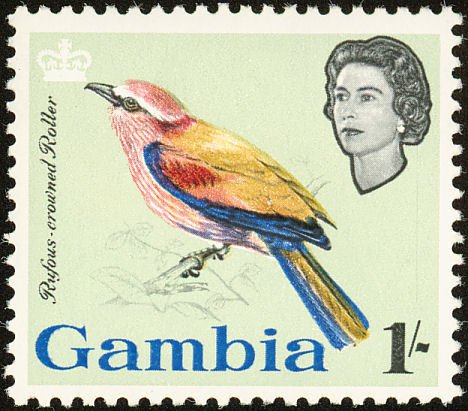 Visibility: public Image owner: none postage 11/4/1963 1sh multi issue=1963 dt=birds (1963 Gambia) d=Rufous-crowned Roller wmk=St Edwards crown & CA perf=12.5x13 Crops No visible images cropped from this one. Measurements Resolution is unknown. Source Source name: Colnect File URL: http://i.colnect.net/b/1462/547/Purple-Roller-Coracias-naevius-.jpg Uploaded August 27, 2014, 3:42 pm by Stan Shebs |
