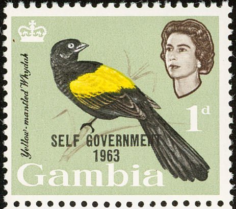Visibility: public Image owner: none postage 11/7/1963 1p multi issue=self government dt=birds (1963 Gambia) d=yellow-mantled whydah ovpt=SELF GOVERNMENT//1963 oc=blk on=issue=1963-1p wmk=St Edwards crown & CA perf=12.5x13 Crops No visible images cropped from this one. Measurements Resolution is unknown. Source Source name: Colnect File URL: http://i.colnect.net/b/1462/553/Yellow-mantled-Widowbird Euplectes-macrourus---overprinted.jpg Uploaded August 27, 2014, 3:42 pm by Stan Shebs |