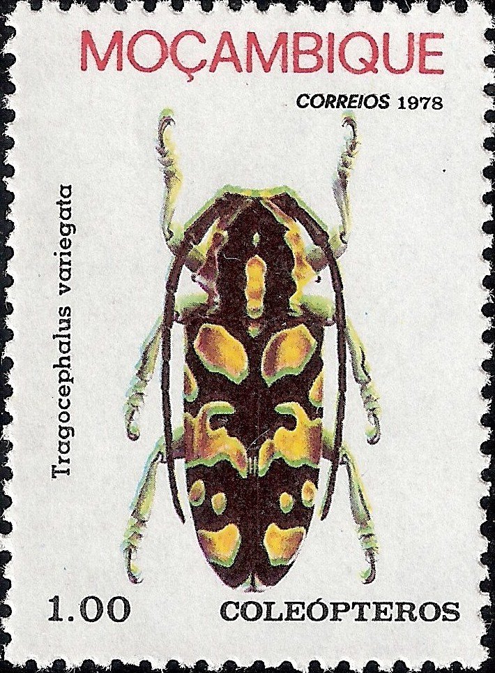 Visibility: public Image owner: none postage 1/20/1978 1.00e multi dt=beetles (1978 Mozambique) d=Tragocephalus variegata unwmk perf=11.5x12 Crops No visible images cropped from this one. Measurements Resolution is unknown. Source Source name: Colnect File URL: http://i.colnect.net/images/b/1115/758/Longhorn-Beetle-Tragocephalus-variegata.jpg Uploaded August 27, 2014, 3:59 pm by Stan Shebs |