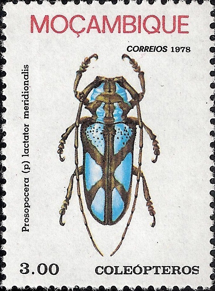 Visibility: public Image owner: none postage 1/20/1978 3.00e multi dt=beetles (1978 Mozambique) d=Prosopocera lactator unwmk perf=11.5x12 Crops No visible images cropped from this one. Measurements Resolution is unknown. Source Source name: Colnect File URL: http://i.colnect.net/images/b/1115/761/Turquoise-Longhorn-Prosopocera-lactator-ssp-meridionalis.jpg Uploaded August 27, 2014, 3:59 pm by Stan Shebs |