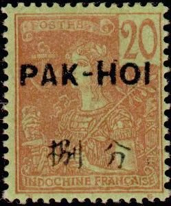 Visibility: public Image owner: none postage 10/1906 20c red pc=grn issue=1906 d=France ovpt=PAK-HOI oc=blk on=issuer=IndoChina-1904-20c unwmk Crops No visible images cropped from this one. Measurements Resolution is unknown. Source Source name: Colnect File URL: http://i.colnect.net/b/867/068/Type-Grasset.jpg Uploaded August 27, 2014, 5:06 pm by Stan Shebs |