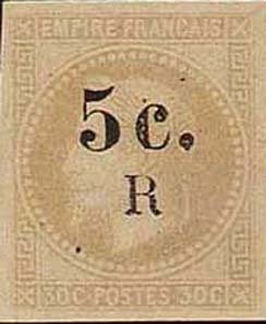Visibility: public Image owner: none postage 5c brn issue=1885 d=Ceres (1871 c) var=large numerals ovpt=value//R oc=blk on=issuer=French Colonies-1871-30c-brn-var=large numerals unwmk imperf Crops No visible images cropped from this one. Measurements Resolution is unknown. Source Source name: Colnect File URL: http://i.colnect.net/b/868/459/Napoleon-surcharged-5c---R.jpg Uploaded August 27, 2014, 5:08 pm by Stan Shebs |