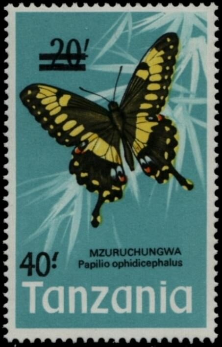 Visibility: public Image owner: none postage 11/17/1975 40sh multi dt=butterflies (1973 Tanzania) d=Papilio ophidicephalus (1973) ovpt=bars//40.' oc=blk on=1973-20sh unwmk perf=14.5 Crops No visible images cropped from this one. Measurements Resolution is unknown. Source Source name: Colnect File URL: http://i.colnect.net/b/5517/308/Emperor-Swallowtail-Papilio-ophidicephalus.jpg Uploaded January 27, 2020, 9:13 pm by Stan Shebs |