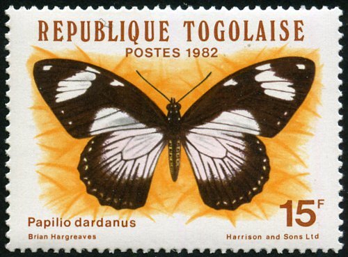 Visibility: public Image owner: none postage 7/15/1982 15fr multi dt=butterflies (1982 Togo) d=Papilio dardanus (1982) unwmk perf=14.75x14.25 Crops No visible images cropped from this one. Measurements Resolution is unknown. Source Source name: Colnect File URL: http://i.colnect.net/b/6054/419/African-Swallowtail-Papilio-dardanus.jpg Uploaded January 28, 2020, 6:31 pm by Stan Shebs |