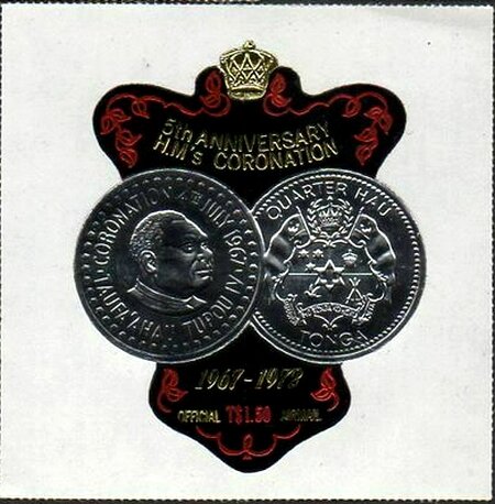 Visibility: public Image owner: none official airmail 7/15/1972 1.50pa multi issue=5th Anniversary of the Coronation of King Taufa’ahau IV wmk=mult crown & script CA Crops No visible images cropped from this one. Measurements Resolution is unknown. Source Source name: Colnect File URL: http://i.colnect.net/b/5781/046/Front-and-back-of-the-coronation-coin.jpg Uploaded January 29, 2020, 4:17 pm by Stan Shebs |