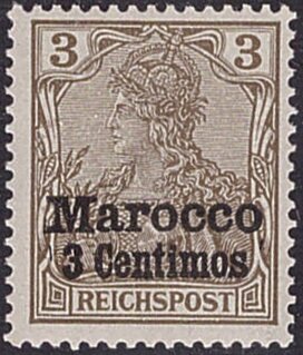 Visibility: public Image owner: none Current identification: postage 10/1/1900 3c brn d=Germania (Reichspost) ovpt=Marocco//value oc=blk on=issuer=Germany-1900-3pf unwmk perf=14x14.25 Crops No visible images cropped from this one. Measurements Resolution is unknown. Source Source name: Colnect File URL: http://i.colnect.net/b/6223/039/Germania-with-overprint.jpg Uploaded March 4, 2020, 10:40 pm by Stan Shebs |