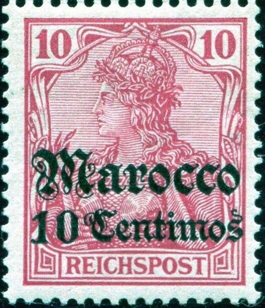 Visibility: public Image owner: none postage 10/1/1905 10c car issue=1905 d=Germania (Deutsches Reich) ovpt=Marocco fraktur//value oc=blk on=issuer=Germany-1902-10pf unwmk perf=14x14.25 Crops No visible images cropped from this one. Measurements Resolution is unknown. Source Source name: Colnect File URL: http://i.colnect.net/b/6220/553/Germania-with-overprint.jpg Uploaded March 4, 2020, 10:41 pm by Stan Shebs |