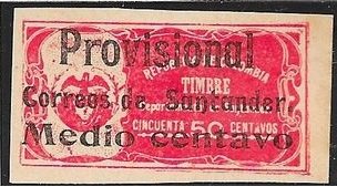 Visibility: public Image owner: none postage 1/2c red issue=1907 d=arms ovpt=Provisional. Correos de Santander. oc=blk on=1903-50c unwmk imperf Crops No visible images cropped from this one. Measurements Resolution is unknown. Source Source name: Colnect File URL: http://i.colnect.net/b/4460/915/-Provisional--on-Revenue-Stamp-MI-1.jpg Uploaded May 7, 2020, 12:58 am by sanguesa |