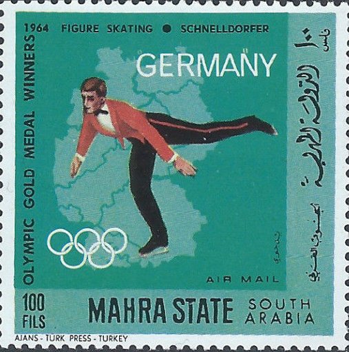 Type: stamp Issuer: Mahra State Date: 1968 Denom: 100f