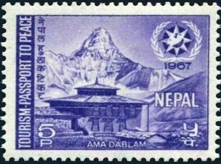 Visibility: public Image owner: none postage 10/24/1967 5p blvio issue=International Tourism Year unwmk Crops No visible images cropped from this one. Measurements Resolution is unknown. Source Source name: Colnect File URL: http://i.colnect.net/b/6376/795/Ama-Dablam-Mountain.jpg Uploaded May 31, 2020, 11:34 am by Stan Shebs |