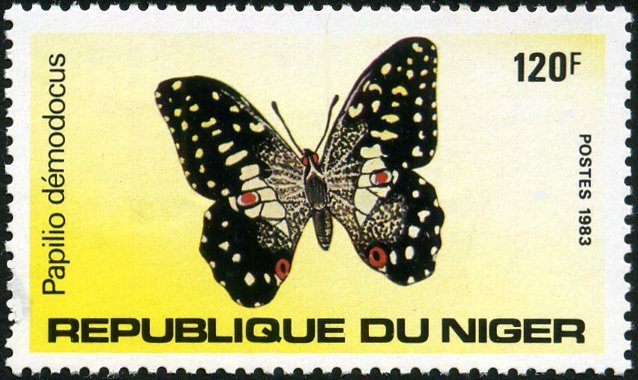 Visibility: public Image owner: none postage 12/9/1983 120fr multi dt=butterflies (1983 Niger) d=Papilio demodocus (1983) unwmk perf=12.25 Crops No visible images cropped from this one. Measurements Resolution is unknown. Source Source name: Colnect File URL: http://i.colnect.net/b/997/711/Citrus-Swallowtail-Papilio-demodocus.jpg Uploaded August 27, 2014, 7:29 pm by Stan Shebs |