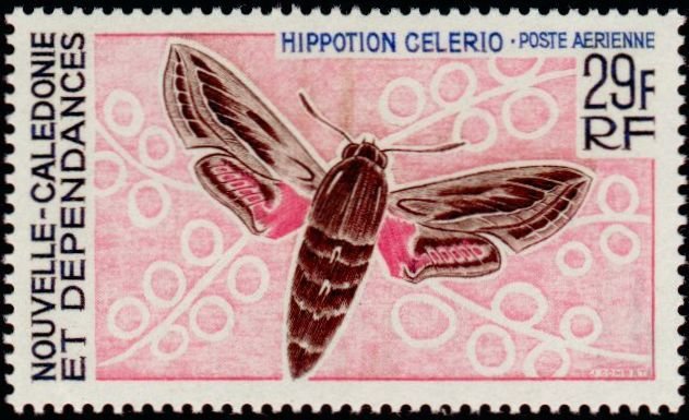 Visibility: public Image owner: none postage 8/10/1967 29fr multi dt=butterflies (1967 New Caledonia) d=Hippotion celerio unwmk Crops No visible images cropped from this one. Measurements Resolution is unknown. Source Source name: Colnect File URL: http://i.colnect.net/b/860/539/Vine-Hawk-Moth-Hippotion-celerio.jpg Uploaded August 27, 2014, 11:09 pm by Stan Shebs |