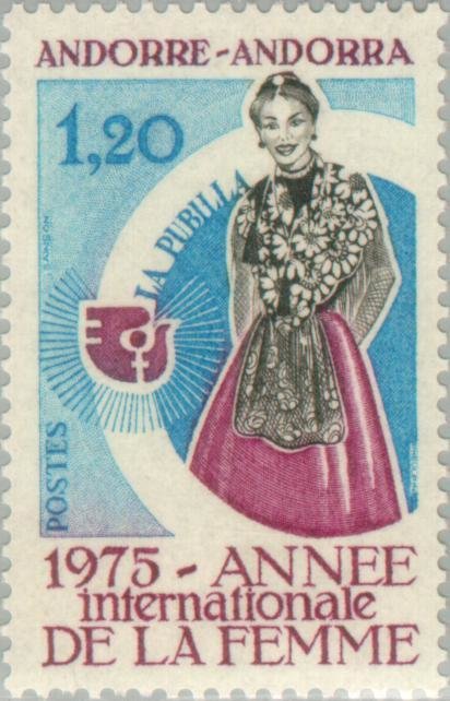 Visibility: public Image owner: none postage 11/8/1975 1.20fr multi issue=International Women's Year unwmk perf=13 Crops No visible images cropped from this one. Measurements Resolution is unknown. Source Source name: Colnect File URL: http://i.colnect.net/b/141/926/Andorran-in-national-costume-Emblem.jpg Uploaded August 28, 2014, 9:05 pm by Stan Shebs |