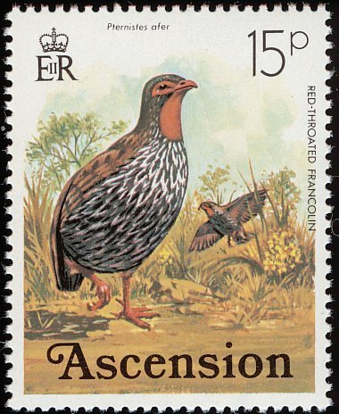 Visibility: public Image owner: none postage 4/26/1976 15p multi issue=1976 dt=birds (1976 Ascension) d=Red-throated Francolin wmk=crown & CA spiral Crops No visible images cropped from this one. Measurements Resolution is unknown. Source Source name: Colnect File URL: http://i.colnect.net/b/1405/640/Red-necked-Spurfowl-Francolinus-afer.jpg Uploaded August 28, 2014, 9:36 pm by Stan Shebs |