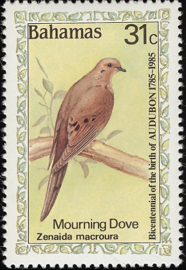 Visibility: public Image owner: none postage 4/24/1985 31c multi issue=200th Anniversary of the Birth of John J. Audubon dt=birds (1985 Bahamas) d=Zenaida macroura (1985 Bahamas) wmk=mult crown & script CA perf=14 Crops No visible images cropped from this one. Measurements Resolution is unknown. Source Source name: Colnect File URL: http://i.colnect.net/images/b/862/677/Mourning-Dove-Zenaida-macroura.jpg Uploaded August 28, 2014, 10:02 pm by Stan Shebs |