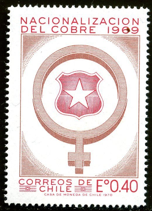 Visibility: public Image owner: none postage 10/21/1970 40c d=copper symbol & arms of Chile unwmk perf=15 Crops No visible images cropped from this one. Measurements Resolution is unknown. Source Source name: Colnect File URL: http://i.colnect.net/b/1441/548/Cooper-Symbol-Chile-Arms.jpg Uploaded August 29, 2014, 1:36 pm by Stan Shebs |