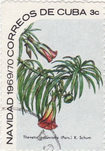 Visibility: public Image owner: none postage 12/1/1969 3c multi issue=Christmas 1969 dt=flowers (1969 Cuba) d=Thevetia peruviana (1969) unwmk perf=12.5 Crops No visible images cropped from this one. Measurements Resolution is unknown. Source Source name: Colnect File URL: http://i.colnect.net/b/1082/300/Theretia-peruviana.jpg Uploaded August 29, 2014, 4:13 pm by Stan Shebs |