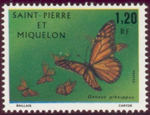 Visibility: public Image owner: none postage 7/15/1975 1.20fr multi dt=butterflies (1975 St. Pierre & Miquelon) d=Danaus plexippus (1975 St. Pierre & Miquelon) unwmk Crops No visible images cropped from this one. Measurements Resolution is unknown. Source Source name: Colnect File URL: http://i.colnect.net/images/b/875/210/Monarch-Butterfly-Danaus-plexippus.jpg Uploaded August 29, 2014, 5:29 pm by Stan Shebs |