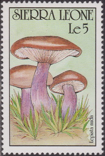 Visibility: public Image owner: none postage 12/31/1990 5le multi dt=mushrooms (1990 Sierra Leone) d=Lepista nuda (1990) unwmk perf=14 Crops No visible images cropped from this one. Measurements Resolution is unknown. Source Source name: Colnect File URL: http://i.colnect.net/images/b/1496/894/Lepista-nuda.jpg Uploaded August 29, 2014, 6:49 pm by Stan Shebs |