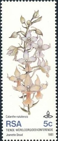 Visibility: public Image owner: none postage 9/11/1981 5c multi issue=10th World Orchid Conference dt=orchids (1981 South Africa) d=Calanthe natalensis (1981) wmk=RSA in triangle Crops No visible images cropped from this one. Measurements Resolution is unknown. Source Source name: Colnect File URL: http://i.colnect.net/b/801/668/Calanthe-natalensis---Forest-dwelling-Calanthe.jpg Uploaded August 29, 2014, 7:09 pm by Stan Shebs |