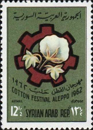 Visibility: public Image owner: none airmail 9/20/1962 12 1/2p multi issue=Cotton Festival at Aleppo 1962 d=Cotton & Cogwheel wmk=national emblem multiple Crops No visible images cropped from this one. Measurements Resolution is unknown. Source Source name: Colnect File URL: http://i.colnect.net/b/1495/396/Cotton-and-Cogwheel.jpg Uploaded August 30, 2014, 2:44 pm by Stan Shebs |