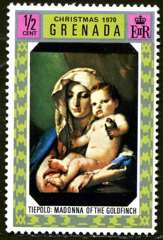 Visibility: public Image owner: none postage 12/5/1970 1/2c multi issue=Christmas 1970 d=Tiepolo: Madonna of the Goldfinch wmk=St Edwards crown & CA perf=15clean Crops No visible images cropped from this one. Measurements Resolution is unknown. Source Source name: Colnect File URL: http://i.colnect.net/images/b/1472/624/Tiepolo-Madonna-with-the-Goldfinch.jpg Uploaded August 30, 2014, 6:51 pm by Stan Shebs |