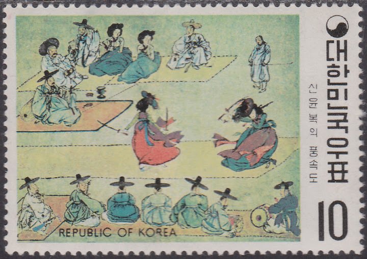 Visibility: public Image owner: none postage 6/20/1971 10w multi dt=Korean Paintings of the Yi Dynasty d="Tea Ceremony" - Shin Yun Bok wmk=winged circle Crops No visible images cropped from this one. Measurements Resolution is unknown. Source Source name: Colnect File URL: http://i.colnect.net/b/1432/583/Sword-dance.jpg Uploaded August 31, 2014, 1:12 am by Stan Shebs |