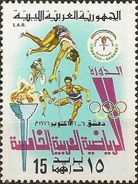 Visibility: public Image owner: none postage 10/6/1976 15dh multi issue=5th Arab Games unwmk Crops No visible images cropped from this one. Measurements Resolution is unknown. Source Source name: Colnect File URL: http://i.colnect.net/b/1412/768/Different-sports-torch-emblem-of-Sport.jpg Uploaded August 31, 2014, 3:21 pm by Stan Shebs |