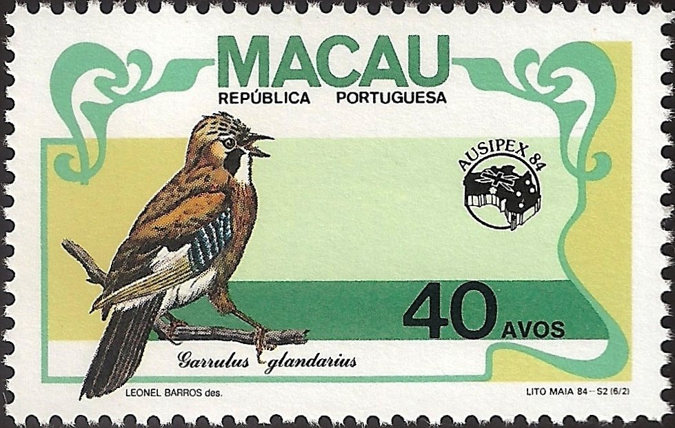 Visibility: public Image owner: none postage 9/21/1984 40a multi issue=Ausipex '84 dt=birds (1984 Macao) d=Garrulus glandarius unwmk perf=13.25 Crops No visible images cropped from this one. Measurements Resolution is unknown. Source Source name: Colnect File URL: http://i.colnect.net/images/b/1455/022/Eurasian-Jay-Garrulus-glandarius.jpg Uploaded August 31, 2014, 5:44 pm by Stan Shebs |
