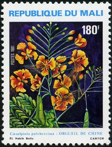 Visibility: public Image owner: none postage 3/16/1981 180fr multi dt=flowers (1981 Mali) d=Caesalpinia pulcherrima (1981 Mali) unwmk perf=12.5 Crops No visible images cropped from this one. Measurements Resolution is unknown. Source Source name: Colnect File URL: http://i.colnect.net/b/1049/616/Flowers---Caesalpinia-pulcherrima.jpg Uploaded August 31, 2014, 6:20 pm by Stan Shebs |