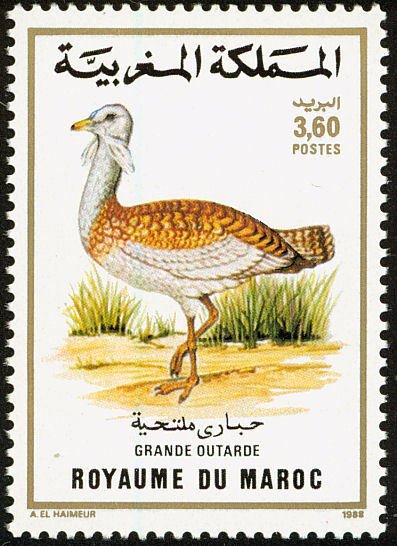 Visibility: public Image owner: none postage 10/26/1988 3.60dh multi dt=birds (1988 Morocco) d=Phoenicopterus ruber (1988) unwmk perf=14 Crops No visible images cropped from this one. Measurements Resolution is unknown. Source Source name: Colnect File URL: http://i.colnect.net/b/1347/819/Great-Bustard-Otis-tarda.jpg Uploaded September 1, 2014, 1:15 pm by Stan Shebs |