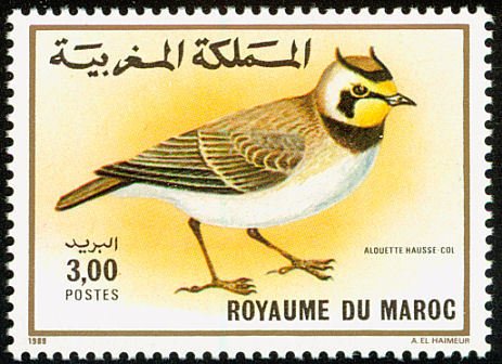 Visibility: public Image owner: none postage 10/16/1989 3.00dh multi dt=birds (1989 Morocco) d=Eremophila alpestris unwmk perf=14 Crops No visible images cropped from this one. Measurements Resolution is unknown. Source Source name: Colnect File URL: http://i.colnect.net/images/b/1347/821/Horned-Lark-Eremophila-alpestris.jpg Uploaded September 1, 2014, 1:15 pm by Stan Shebs |