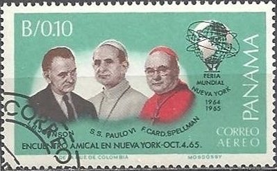 Visibility: public Image owner: none postage 4/4/1966 0.10b multi issue=Visit of Pope Paul VI - at the United Nations in New York, 1965 d=Airmail unwmk Crops No visible images cropped from this one. Measurements Resolution is unknown. Source Source name: Colnect File URL: http://i.colnect.net/b/1567/697/President-L-B-Johnson-Pope-Paul-VI---Cardinal-Spellman.jpg Uploaded September 1, 2014, 4:36 pm by Stan Shebs |