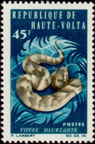 Visibility: public Image owner: none postage 7/15/1966 45fr multi issue=1966 dt=animals (1966 Upper Volta) d=Bitis arietans (1966) unwmk Crops No visible images cropped from this one. Measurements Resolution is unknown. Source Source name: Colnect File URL: http://i.colnect.net/b/509/087/Puff-Adder-Bitis-arietans.jpg Uploaded September 1, 2014, 6:42 pm by Stan Shebs |