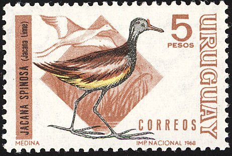 Visibility: public Image owner: none postage 5/15/1968 5p multi dt=birds (1968 Uruguay) d=Jacana spinosa (1968) wmk=large sun & ROU Crops No visible images cropped from this one. Measurements Resolution is unknown. Source Source name: Colnect File URL: http://i.colnect.net/b/1127/564/Wattled-Jacana-Jacana-jacana.jpg Uploaded September 1, 2014, 6:45 pm by Stan Shebs |