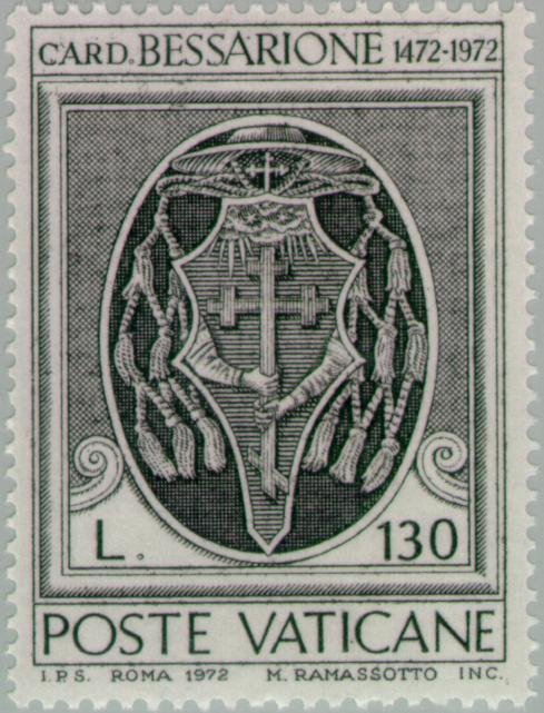 Visibility: public Image owner: none postage 11/28/1972 130l gray&blk issue=500th Anniversary of the Death of Bessarione unwmk perf=13.5x14 Crops No visible images cropped from this one. Measurements Resolution is unknown. Source Source name: Colnect File URL: http://i.colnect.net/b/151/036/Coat-of-arms-of-Cardinals.jpg Uploaded May 22, 2013, 5:42 pm by Stan Shebs |