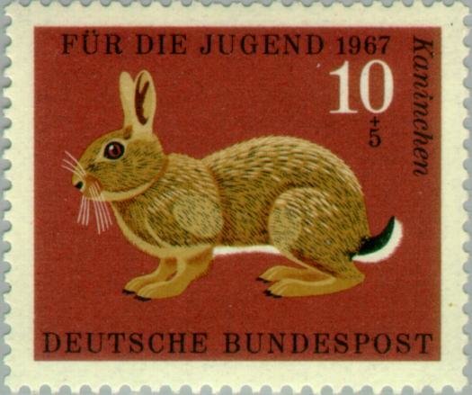 Visibility: public Image owner: none semipostal 4/4/1967 10+5(pf) multi issue=youth 1967 dt=animals (1967 Germany) d=rabbit (1967) unwmk Crops No visible images cropped from this one. Measurements Resolution is unknown. Source Source name: Colnect File URL: http://i.colnect.net/b/152/589/European-Rabbit-Oryctolagus-cuniculus.jpg Uploaded September 1, 2014, 9:58 pm by Stan Shebs |