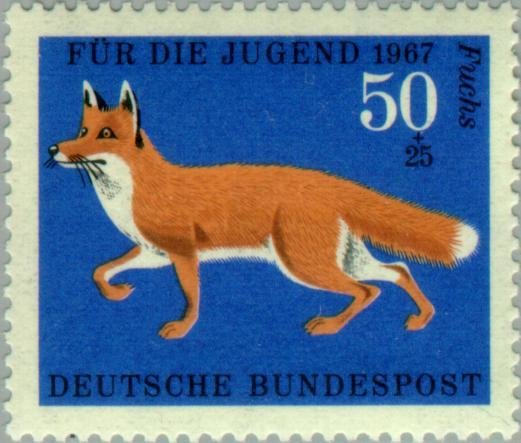 Visibility: public Image owner: none semipostal 4/4/1967 50+25(pf) multi issue=youth 1967 dt=animals (1967 Germany) d=red fox (1967 Germany) unwmk Crops No visible images cropped from this one. Measurements Resolution is unknown. Source Source name: Colnect File URL: http://i.colnect.net/b/152/592/Red-Fox-Vulpes-vulpes.jpg Uploaded September 1, 2014, 9:58 pm by Stan Shebs |