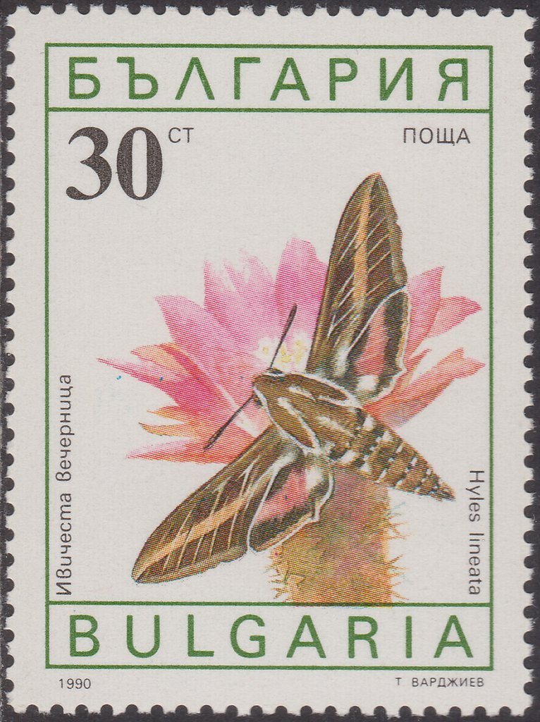 Visibility: public Image owner: none postage 8/8/1990 30s multi dt=butterflies (1990 Bulgaria) d=Hyles lineata (1990) unwmk perf=12.75 Crops No visible images cropped from this one. Measurements Resolution is unknown. Source Source name: Colnect File URL: http://i.colnect.net/images/b/1453/822/White-lined-Sphinx-Hyles-lineata.jpg Uploaded September 2, 2014, 3:55 pm by Stan Shebs |