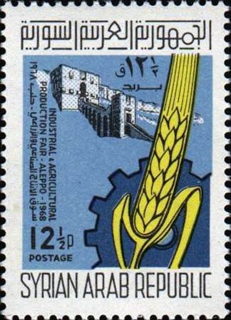 Visibility: public Image owner: none postage 7/18/1968 12 1/2p multi issue=Industrial and Agricultural Fair, Aleppo unwmk Crops No visible images cropped from this one. Measurements Resolution is unknown. Source Source name: Colnect File URL: http://i.colnect.net/images/b/1506/101/Citadel-of-Aleppo---Wheat--amp--Cogwheel.jpg Uploaded September 2, 2014, 4:18 pm by Stan Shebs |