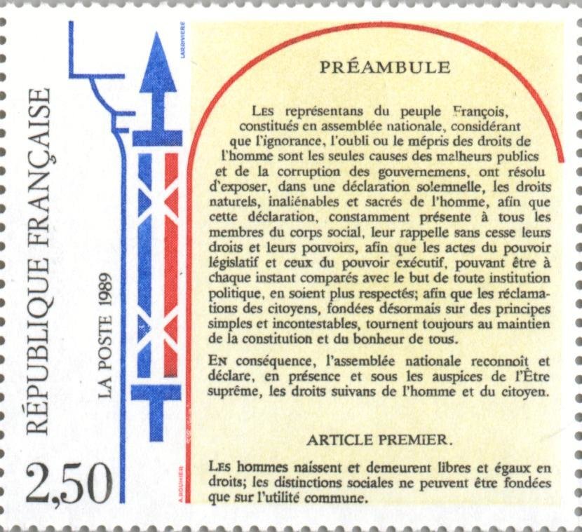 Visibility: public Image owner: none postage 8/26/1989 2.50fr multi issue=200th Anniversary of the Declaration of Rights of Man unwmk perf=13x11.75 Crops No visible images cropped from this one. Measurements Resolution is unknown. Source Source name: Colnect File URL: http://i.colnect.net/b/145/904/Declaration-of-the-Rights-of-Man-and-Citizen-Preamble-and-A.jpg Uploaded September 2, 2014, 6:57 pm by Stan Shebs |