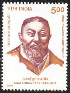 Visibility: public Image owner: none postage 12/9/1996 5r multi issue=150th Anniversary of the Birth of Abai Konunbaev d=Abai Konunbaev wmk=Asokan capital Crops No visible images cropped from this one. Measurements Resolution is unknown. Source Source name: Colnect File URL: http://i.colnect.net/b/554/208/Abai-Konunbaev.jpg Uploaded September 3, 2014, 4:18 pm by Stan Shebs |