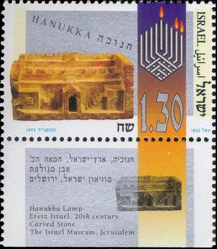 Visibility: public Image owner: none postage 12/9/1993 1.30nis multi issue=Hanukka 1993 unwmk Crops No visible images cropped from this one. Measurements Resolution is unknown. Source Source name: Colnect File URL: http://i.colnect.net/b/782/933/Hanukkah-Stone-Lamp-20th-century.jpg Uploaded September 3, 2014, 6:12 pm by Stan Shebs |